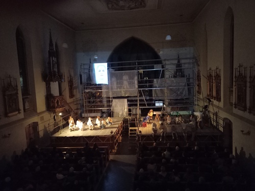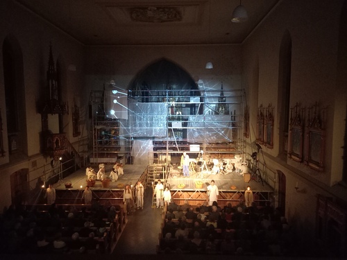 Andreas Jähnert und sein Team inszenierten – in den Grundelementen eines Gottesdienstes – ein beeindruckendes Stück immer in Verbindung zu uns und unserer Gemeinde mit ihrer Geschichte und ihren Geschichten. Immer wieder wurden an den - von KI aus x-Fotos erstellen - „Durchschnittsegger“ Fragen gestellt. Die KI-Stimme gab Antworten und warf gleichzeitig Fragen auf. Gute Nachrichten wurden gesucht. Wir hörten die Predigt von der Kanzel. Der Frage, wer denn „Vater Unser“ sei, wurde nachgegangen und mit dem erlebbaren Wir wurden wir zum Teilen von Essen und Trinken animiert. Ein starkes Plädoyer für „Give peace a chance“ bildete den theatralischen Abschluss bevor wir uns noch einmal auf unsere Heimat und Herkunft besannen und in einem großen Gemeinschaftschor – aus Akteur:innen und Besucher:innen „ein Wälderdorf“ erklang.